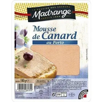 Graisse de porc, foie de canard maigre 22%, graisse de canard 15%, foie de poulet, eau, couenne de porc, saindoux, Porto 1,7%, crème (LAIT), farine de BLÉ, sel, sucre, lait écrémé en poudre, arômes naturels, poivre, ferments, colorant : lutéine et extrait de paprika. Peut contenir DES OEUFS.
