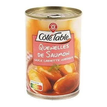 Ce produit contient de l'eau, des raviolis au saumon 36 % (farine de blé, graisse de boeuf, saumon atlantique 4,7 %, eau, blanc d'œuf, saumon atlantique fumé (saumon, sel) 3,6 %, sel, gluten de blé, lactose et protéine de lait), crème fraîche, farine de blé, concentré de tomate, amidon de maïs modifié, vin blanc, poudre de crevettes nordiques déshydratées 0,2 %, cognac modifié (cognac, sel, arôme naturel de poivre), poudre d'oignon, curcuma, poudre d'ail. Peut contenir des traces de mollusques.