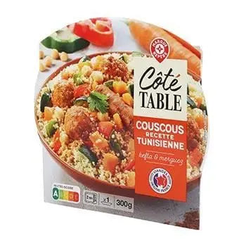 Semoule réhydratée, Eau, Boulettes de viande de kefta précuites, Bœuf, Protéine de blé texturée réhydratée, Blancs d'œufs, Chapelure, Oignons réhydratés, Sel, Épices, Fécule de pomme de terre, Fibre de pois, Coriandre, Stabilsants : E450, E451, E452, Merguez de dinde et de mouton, Viande de dinde, Graisse de mouton, Viande de mouton, Fenouil, Ail, Dextrose, Sirop de glucose, Arômes naturels, Carottes, Navets, Courgettes, Poivrons rouges et verts, Oignons, Purée de tomates triple, Pois chiches, Fécule de maïs, Huile de tournesol, Arôme, Sucre, Extrait de paprika.