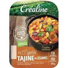 Légumes 80% (courgettes, pulpe de tomate, poivrons rouges, aubergines pré-frites et oignons pré-frits y compris de l'huile de tournesol), pois chiches 5,2%, sultanines 3,8% (raisins, huile de colza), jus de citron, ail, citrons confits, huile d'olive extra vierge, gingembre, coriandre, sel, amidon de riz, cumin.