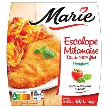 Spaghetti cuits 32% (eau, semoule de blé dur, œufs de plein air, huile de colza), escalope de dinde cuite reconstituée panée et cuite 31,6% [filets de dinde reconstitués 23,1% (filets de dinde originaires de France 19,3%, eau, sel, fécule de maïs), panure 8,5% (farine de blé, sel, levure, curcuma, paprika), huile de tournesol], pulpe de tomate en jus 12,4%, (tomates, jus de tomate), eau, concentré de tomate 5,2%, huile d'olive vierge, oignon pré-frit (oignon, huile de tournesol), farine de blé, purée d'ail, basilic 0,7%, sucre, sel, concentré de jus de citron. Traces possibles : poisson, crustacés, mollusques, soja, lait, moutarde, céleri.