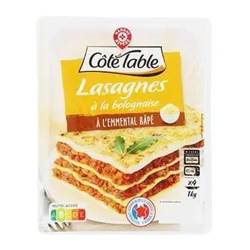 Ce produit contient de l'eau, des pâtes précuites 20% (semoule de blé dur, eau), du bœuf 16% (origine : France), de la purée de tomate triple concentrée 4%, des tomates pelées écrasées dans du jus 4% (tomates fraîches, jus de tomate), du fromage Emmental râpé 4%, des carottes, des oignons, de l'huile de colza, de la farine de blé, de la poudre de lait écrémé, de l'amidon de maïs modifié, du basilic, du sel, du bouillon de veau aromatisé (amidon de pomme de terre, arômes naturels, sel, herbes, maltodextrine de pomme de terre, tomate déshydratée, sucre, graisse de poulet, veau déshydraté, sucre caramélisé, épices), de l'amidon de maïs, de l'ail, du persil, du poivre noir, du thym 0,02%, de la muscade. Peut contenir des traces d'œuf, de poisson et de soja.