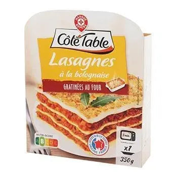 Ce produit contient de l'eau, des pâtes précuites 22% (semoule de blé dur, eau, poudre d'œuf entier), du bœuf 14% (origine : France), du fromage Emmental râpé 4,3%, de l'huile de colza, de la purée de tomates triple concentrée 3,5%, des tomates pelées concassées dans du jus 3,5% (tomates pelées concassées, jus de tomate), des carottes, de la farine de blé, des oignons, de la poudre de lait écrémé, de l'amidon de maïs modifié, du basilic, de l'amidon de maïs, du sel, un bouillon de veau aromatisé (amidon de pomme de terre, arômes naturels, sel, herbes, maltodextrine de pomme de terre, tomate déshydratée, sucre, graisse de poulet, veau déshydraté, sucre caramélisé, épices), de l'ail, du persil, du poivre noir, du thym 0,02%, de la muscade. Le produit est fabriqué en France et transformé en Europe. Le blé provient du Canada et/ou d'Europe, le bœuf est sourcé en France, et les tomates sont sourcées d'Espagne, d'Italie et/ou du Portugal.