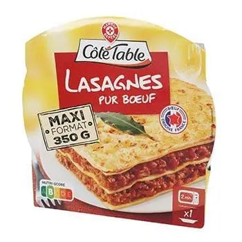 Ce produit contient de l'eau, du bœuf (Origine : France) 17%, des tomates 15%, des pâtes à lasagne 8,5% (semoule de BLE dur, eau, OEUFS), de la pâte de tomate 4%, de l'amidon de maïs, des carottes, de la CRÈME fraîche, des miettes de pain (farine de BLE, eau), de l'huile d'olive extra vierge 0,8 %, des oignons déshydratés, des arômes (y compris le GLUTEN), de la farine de BLE, de l'ail, du basilic 0,4 %, du sucre, du sel, des minéraux marins (potassium, magnésium, calcium), de l'origan 0,1 %, des épices. Peut contenir des traces de céleri, crustacés, moutarde et poisson.