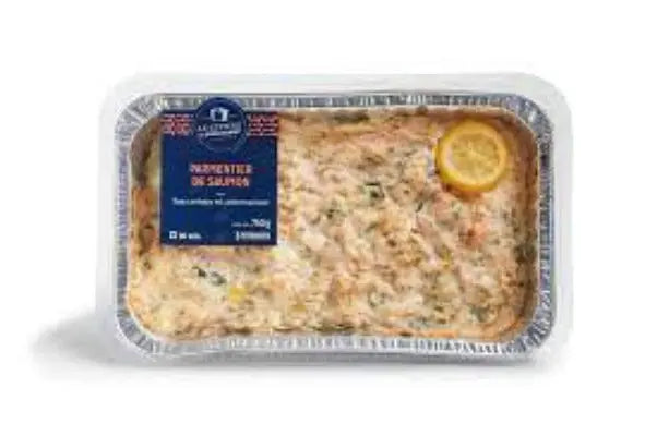 Une couche de purée de pommes de terre avec de petits morceaux de pommes de terre fondantes. Une garniture de saumon et de crème avec une fondue de poireau et d'oignon, rehaussée par une touche de citron. Une recette délicieuse et crémeuse "fait maison".