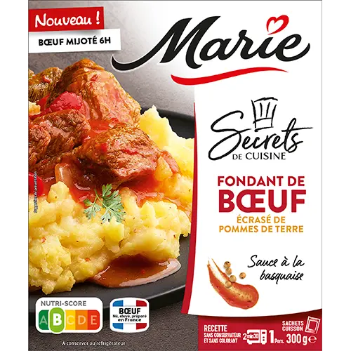 Marie présente son fondant de bœuf d'origine française certifié, une recette traditionnelle avec une sauce cuite à la façon basquaise, accompagnée d'une purée de pommes de terre crémeuse et relevée d'une touche de piment d'Espelette. Le plat ne contient ni conservateurs, ni additifs, ni colorants, afin de garder uniquement le meilleur des saveurs.