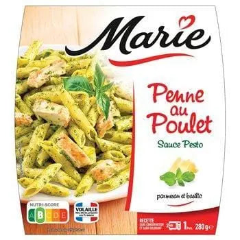 Marie sélectionne du poulet né, élevé et préparé en France. Parce que les recettes les plus simples sont parfois les meilleures, Marie cuit soigneusement son pesto avec de l'huile d'olive vierge, du basilic et du parmesan.