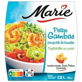 gambas cuites 37% (eau, semoule de BLÉ dur, œufs de plein air, huile de colza), petites GAMBAS 22,7% (CREVETTES, eau, sel, SULFITES), tomates 9,8%, eau, concentré de tomates 4,3%, oignons pré-frits (dont huile de tournesol), tomates semi-déshydratées et marinées 2,6% (tomates, huile de colza, sel, origan, ail), épinards 2,2%, échalotes, tomates pelées écrasées dans du jus 1,7% (tomates, jus de tomate), GRANA PADANO AOP 0,9% (contient DU LAIT, ŒUF), huile d'olive vierge 0,8%, sucre, PARMESAN (PARMIGIANO REGGIANO AOP) 0,7%, huile de colza, farine de BLÉ, poivrons, épices et herbes, sel, huile de tournesol, jus de citron concentré, basilic 0,2%, extrait de basilic, purée d'ail 0,1%. Pâte : origine italienne. Crevettes : origine hors UE. Tomate : origine UE et hors UE. Traces possibles de : poisson, crustacés, soja, moutarde, céleri.