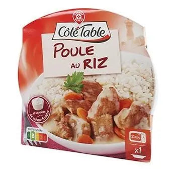 Ce produit contient du riz cuit 37 % (eau, riz blanc, huile de tournesol, sel, colorant : curcumine, épices [y compris le safran], LACTOSE, arômes), de la viande de poulet cuite et précuite 27 % (viande de poulet (origine : UE), eau, sel, dextrose, stabilisant : E451), eau, carottes 4,3 %, oignons, CRÈME fraîche 1,6 %, amidon de maïs, farine de BLÉ, arômes naturels, poudre d'ail, jus de citron concentré, thym, poivre. Peut contenir des traces de moutarde, œuf, céleri, crustacés, poisson et mollusques.