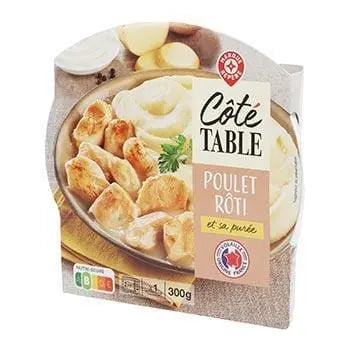 Purée de pommes de terre, pommes de terre, eau, beurre, crème fraîche, sel, épaississants (gomme xanthane, gomme guar), curcuma, conservateur (disulfite de sodium), viande de poulet curée et rôtie, viande de poulet, amidon de pomme de terre, dextrose, crème fraîche, amidon de maïs, oignons déshydratés, arômes (y compris du blé), ail, extrait de malt d'orge, poivre. Peut contenir des traces de céleri, de crustacés, de mollusques, de moutarde, d'œufs et de poisson.
