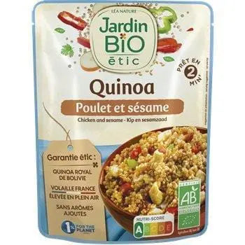 Eau, quinoa blanc* 29%, légumes* 18,1% (purée de tomates doublement concentrée*, morceaux de poivron vert*, morceaux d'oignon*, morceaux de poivron rouge*), préparation de poulet* 7% (viande de cuisse de poulet*, eau, fécule de pomme de terre*), huile d'olive extra vierge*, graines de SÉSAME entières* 2,3%, épices*, sel de mer, persil*, purée d'ail*, sucre de canne*. *Produits issus de l'agriculture biologique. Peut contenir des traces de gluten et de soja.