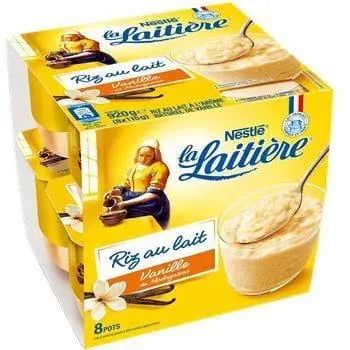 Lait entier (70,3 %), sirop de glucose, riz (10,0 %), eau, sucre, poudre de LAIT écrémé, sel, arôme naturel de vanille, colorant (annatto). LAIT provenant de France.