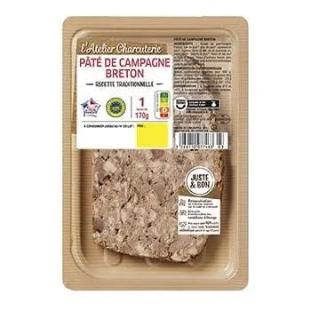 Viande de porc* (origine française), foie de porc*, graisse de porc*, couenne de porc*, oignons, farine de BLE, sel de Guérande, ail, poivre. Garniture : longe de porc*. Traces de lait, œuf et noix. *Provenant d'animaux nourris sans OGM (<0, 9%) et élevés sans traitement antibiotique après le premier âge (42 jours). Origine du porc : FRANCE
