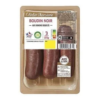 Notre produit est fabriqué avec un mélange de 31% d'oignons, de graisse de porc, de sang de porc, de couenne de porc et de sel de Guérande. Il comprend également du saccharose, des épices, un antioxydant : E331, et du dextrose pour plus de saveur. Le produit est embelli dans un boyau naturel de porc. Le porc utilisé dans ce produit provient de France et vient d'animaux nourris sans OGM (<0,9%) et élevés sans traitement antibiotique après le premier âge (42 jours). Veuillez noter que ce produit peut contenir des traces de gluten, de moutarde, de lait, de noix et d'œuf.