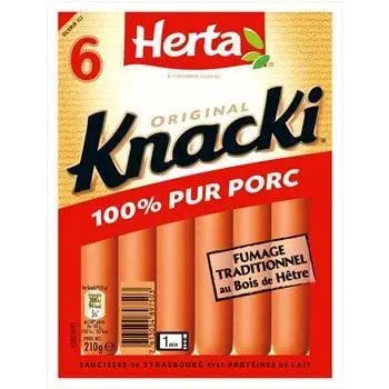 Tout le plaisir de KNACKI Original 100 % pur porc avec un goût délicat de fumé au hêtre. Pour les enfants de moins de 4 ans, coupez la saucisse dans le sens de la longueur puis en très petits morceaux pour éviter l'étouffement.