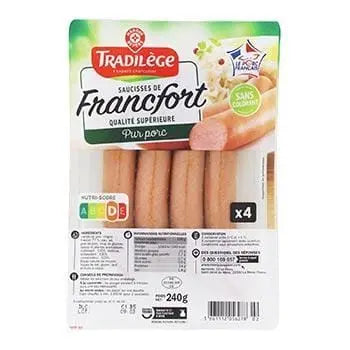 Viande de porc (origine française), Eau, Sel, Graisse de porc, Sirop de glucose, Épices, Plantes aromatiques, Stabilisant : E450, Dextrose, Antioxydant : E301, Conservateur : E250, Enveloppe de mouton naturel.