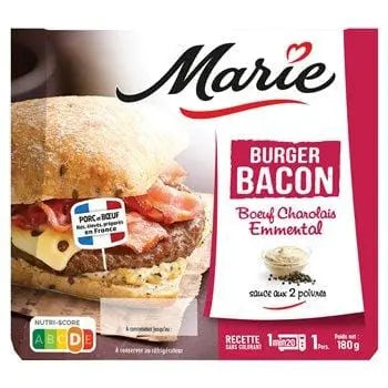 Marie sélectionne des ingrédients de qualité : le steak de ce burger est composé à 100 % de pur bœuf Charolais garanti d'origine française par un organisme de contrôle indépendant, le bacon provient de porcs nés, élevés et préparés en France. Marie apporte tout son savoir-faire culinaire à ce burger et prépare cette sauce avec du poivre vert et noir.
