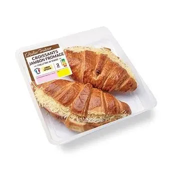 Croissant 37 % (farine de blé, beurre 6,7 %, lait demi-écrémé, eau, sucre, levure désactivée, œuf, sel, gluten de blé, farine de malt de blé, agent de traitement de la farine : acide ascorbique), jambon cuit supérieur 23 % (jambon de porc (origine : France) 21 %, sel, dextrose, poudre végétale (bette ; carotte), ferment), lait demi-écrémé 17 %, crème liquide 8,6 %, fromage Emmental 7 %, beurre 2,6 %, farine de blé, jaune d'œuf, sel, poivre, muscade.