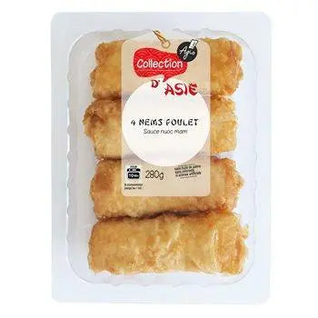 Nems (4x65g) : Gâteau de riz 34.7% (eau, farine de riz, huile de tournesol, sel), viande de poulet (origine : UE) 22.8%, vermicelle de pois réhydraté, carottes, oignons, champignons noirs réhydratés, oignon déshydraté, oignons frits (oignons, huile de tournesol), fibre de bambou, sel, sauce SOJA (eau, grains de SOJA, sel, farine de BLÉ), poivre. Sauce nuoc mam (20g) : eau, sucre, nuoc mam 14% (POISSON, sel, eau), vinaigre d'alcool, sel. Traces possibles de poisson, crustacés, mollusques, lait, œuf, moutarde, céleri, sésame, noix.