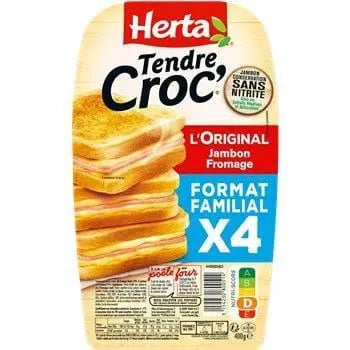 Profitez du Croque-Monsieur JAMBON et FROMAGE TENDRE CROC' : deux tranches de pain à sandwich à la fois croustillantes et moelleuses avec une garniture de jambon fondant préservée sans nitrite grâce à des extraits de plantes et des antioxydants. Le croque-monsieur HERTA est la solution pratique pour une pause déjeuner, un dîner gourmet en famille ou entre amis. Au four ou à la poêle, tout le monde va l'apprécier !