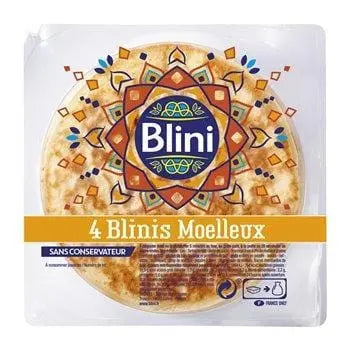 Crêpe d'origine russe de 50g. Emballée dans une atmosphère protectrice. Une texture légère, une recette sans conservateurs : parfaite pour vos apéritifs ! 4 grands blinis moelleux à dorer dans un grille-pain, idéaux en entrée avec du saumon fumé.