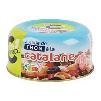Thon précuit haché 23%, eau, oignons 9,8%, poivrons rouges 9,6%, poivrons verts 7,6%, purée de tomates double concentration 7%, haricots verts 6%, huile de colza, spécialités céréalières 3,6% (semoule de blé dur, poudre de blanc d'œuf), huile d'olive extra vierge, sucre, olives noires 1% (olives, sel), vinaigre d'alcool, sel, herbes, poivre blanc, moutarde de Dijon (eau, graines de moutarde, vinaigre d'alcool, sel), concentré de jus de citron, agents épaississants : gomme de guar, gomme xanthane, arôme naturel, arôme naturel de thym.