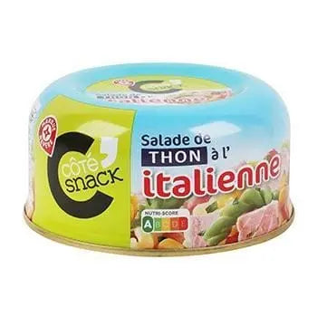 Ce produit contient du thon découpé précuit (23 %), de l'eau, du maïs (15 %), des tomates (13 %), des carottes (12 %), de l'huile de colza, des spécialités céréalières (3,6 %) à base de semoule de blé dur et de poudre de blanc d'œuf, des spécialités céréalières d'épinards (3,1 %) à base de semoule de blé dur, d'œuf et de poudre d'épinard, des plantes aromatiques, de l'ail, du poivre blanc, du vinaigre d'alcool, du sel et des agents épaississants : gomme xanthane, gomme de guar.