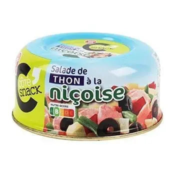 Ce produit contient du thon haché précuit (23 %), des pommes de terre (20 %), des tomates (15 %), des haricots verts (12 %), des oignons (8 %), de l'eau, de l'huile de colza, des olives noires (3,5 %) (olives noires, sel, stabilisant : E579), des poivrons rouges (2,5 %), de l'huile d'olive extra vierge, du sel, du vinaigre de vin blanc, du sucre, des arômes naturels, un épaississant : gomme de guar, du basilic et un arôme de poivre naturel.