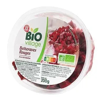 Red beetroot in its juice cooked* 82% (beetroot* 73%, beetroot juice*), sunflower oil*, shallots* 3.7%, olive oil*, spirit vinegar*, water, mustard* (cider vinegar*, mustard seeds*, water, salt, acidifying agent: citric acid), salt, cane sugar*, concentrated lemon juice*, pepper*, thickening agent: xanthan gum. *Ingredients from organic farming.